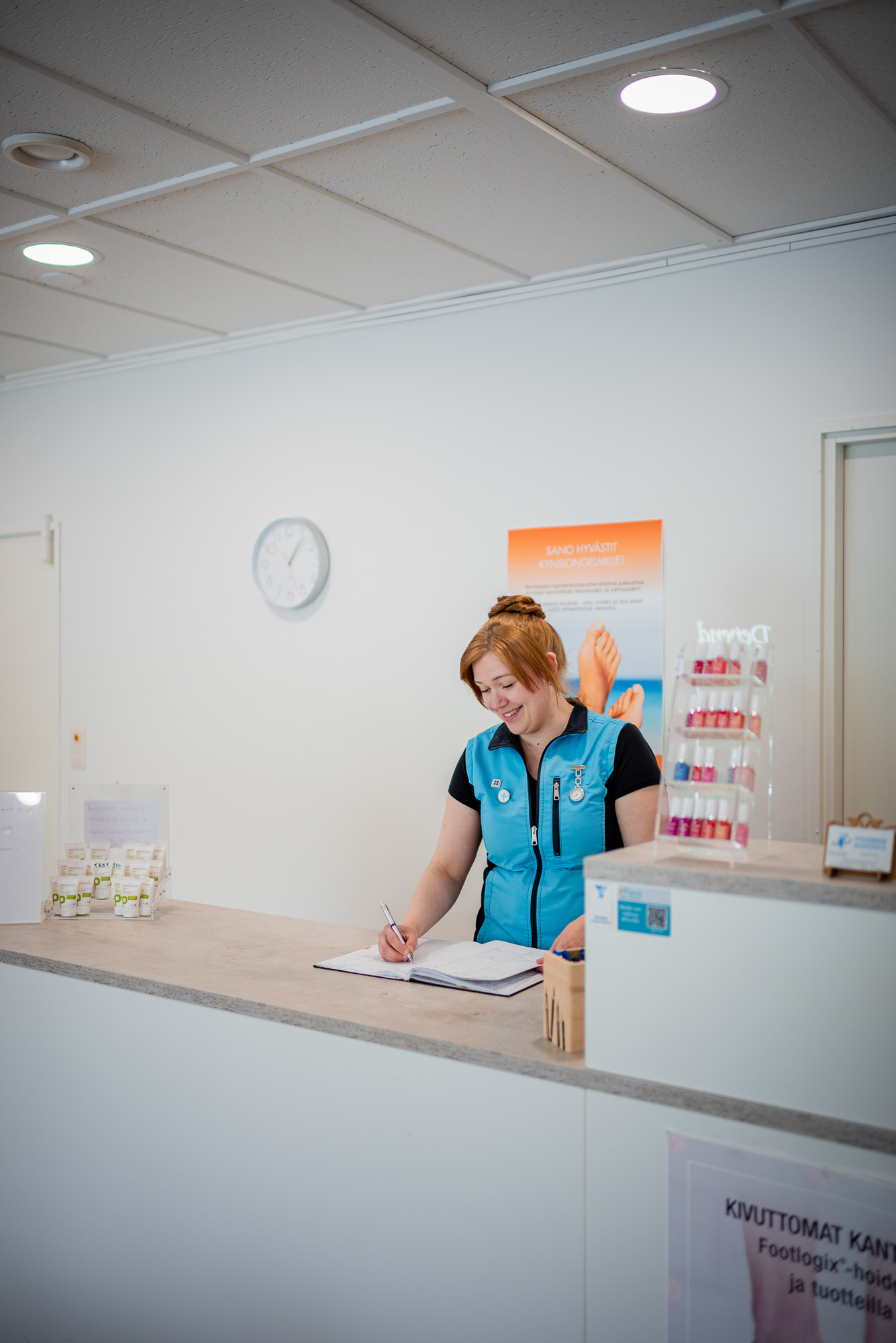 Sis. jalkojen kylvetys, mikäli ei rajoitteita, ongelmien poisto ja ehkäisy, kynsien ja ihon siistiminen. Kevyt hieronta rasvauksen yhteydessä.